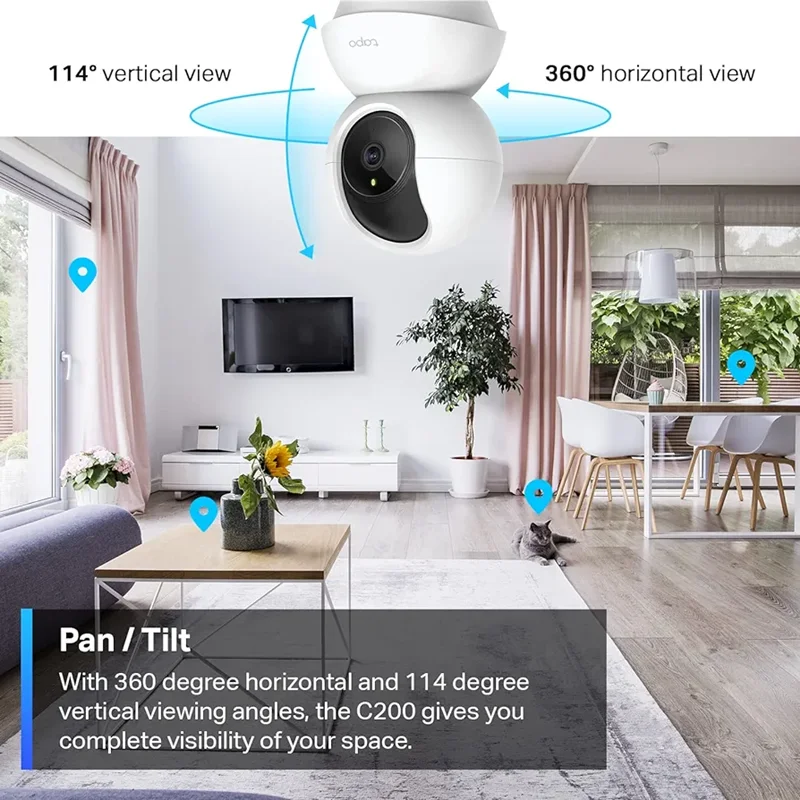 دوربین Tapo C200 برند Tapo با قابلیتهای ویژهای برای نظارت داخلی طراحی شده است. این دوربین با قابلیت چرخش 360 درجه افقی و 114 درجه عمودی، امکان مشاهده کامل یک اتاق یا راهرو را فراهم میکند. با دریافت اعلانهای فوری در صورت شناسایی حرکت یا شخص، میتوانید از دوربین به عنوان مانیتور کودک استفاده کنید و از Tapo Care برای شناسایی گریه کودک بهره ببرید. همچنین، با قابلیت صوت دوطرفه و زنگ هشدار داخلی، میتوانید با حیوان خانگی خود ارتباط برقرار کنید یا از ورود مزاحمان جلوگیری کنید. تصاویر میتوانند بر روی کارت microSD تا 128 گیگابایت ذخیره شوند یا با اشتراک Tapo Care به ذخیرهسازی ابری و مزایای اضافی دسترسی پیدا کنید. سیستم دید در شب این دوربین تا 30 فوت را پوشش میدهد و هیچ چیز را در شب از دست نمیدهید.