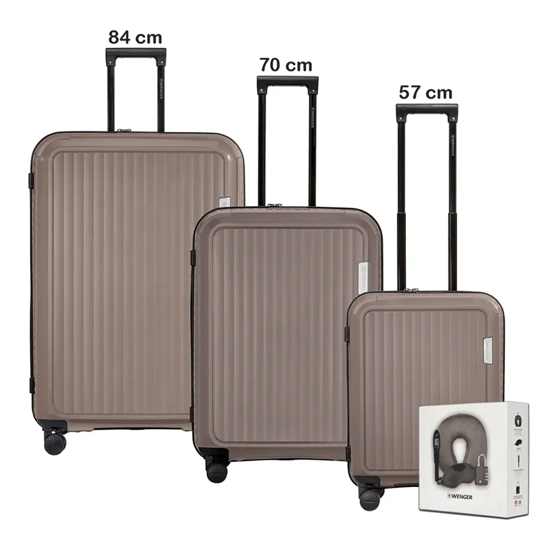 ست چمدانهای Wenger Optimo سه تکه با طراحی حرفهای، کیفیت ساخت فوقالعاده و بدنهای مقاوم از پلیکربنات سبک و ضدضربه، انتخابی مطمئن برای سفرهای کاری یا تفریحی است. این مجموعه شامل چمدانهای سایز کابین، متوسط و بزرگ بوده که هر سه دارای قابلیت افزایش حجم (Expandable) برای حمل وسایل بیشتر هستند. چرخهای روان، طراحی مدرن و امنیت بالا از دیگر ویژگیهای این ست استثنایی است. همچنین با خرید این محصول، یک بسته لوازم جانبی سفر اورجینال نیز بهصورت هدیه همراه آن ارائه میشود.