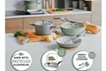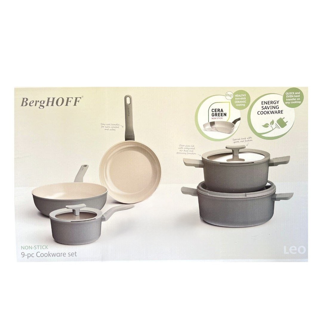 ست ۹ تکه BergHOFF Leo از جنس آلومینیوم دایکست با پوشش سرامیکی CeraGreen نچسب و بدون مواد سمی PFAS و PTFE ساخته شده و شامل ماهیتابههای ۸ و ۱۰ اینچی، قابلمه سس ۶.۲۵ اینچی با درب، قابلمه sauté ۱۰.۲۵ اینچی، قابلمه stockpot ۸ اینچی و بزرگ ۱۰ اینچی با درب میباشد. دستههای آن از رزین فنولیک و دارای طراحی Stay-cool برای ایمنی و راحتی هستند و دربها با لبه سیلیکونی برای جلوگیری از صدا و ریختن مایعات طراحی شدهاند. این ست با اجاقهای القایی، شیشهای، سرامیکی و گازی سازگار است، امکان شستوشوی آسان دارد (دستشویی توصیه میشود) و امکاناتی مانند سوراخ آبکشی یکپارچه و محل قرار دادن قاشق روی درب، کاربری راحت و آشپزی بدون بهمریختگی را فراهم میکند.