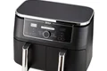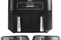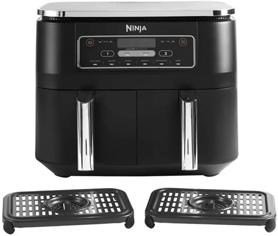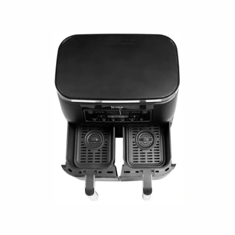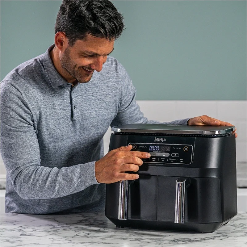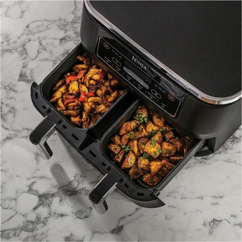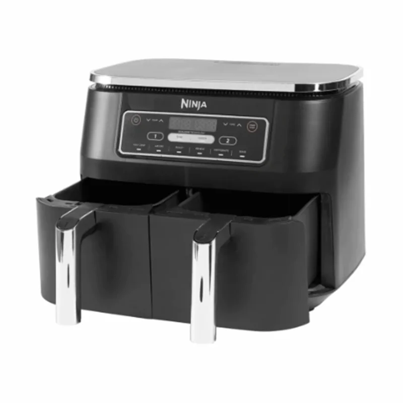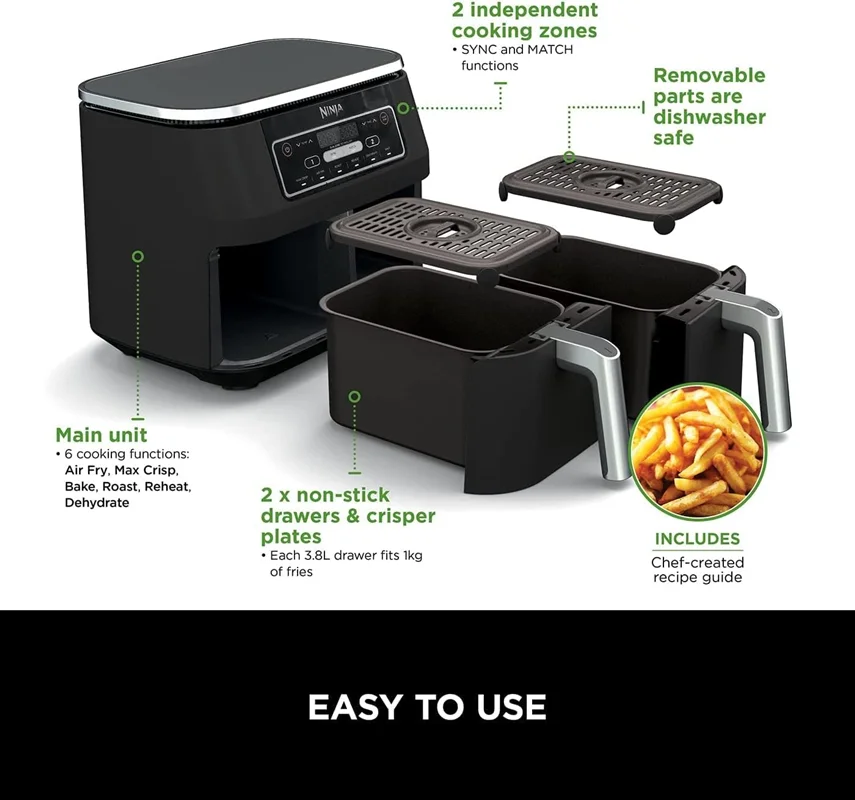 سرخ کن دو قلو نینجا NINJA AF300ME ،توان مصرفی: توان موتور این دستگاه برابر با 1670 وات و حداکثر آن 2470وات است. این میزان برای گنجایش 7.6 لیتری این محصول بسیار مناسب میباشد. المنت های گرمایی در دو سبد،بطور مجزا طراحی شده تا امکان پخت دو نوع غذا بطور همزمان فراهم شود.برنامه های پخت: پخت حداکثری(MAX Crips)،ترد کردن مانند شیرینی و کیک(Beak)،سرخکن(Air fryer)،کباب کردن(Air Roast)،گرم کردن مجدد(Reheat)،خشک کردن میوه و سبزیجات(Dehydrate)،در ادامه این مطلب بطور مفصل راجب کار با محصول و چگونگی برنامه ریزی آموزش خواهیم داد.گنجایش مخزن: همانطور که پیش از این گفتیم،گنجایش کلی سرخ کن دوقلو نینجا مدل AF300، هفت و شش دهم لیتر(7.6لیتر) میباشد. به این معنی که این محصول دارای 2 سبد با گنجایش 3.8 لیتر است. تقریبا در هر کدام از این مخزن ها یک مرغ 1.2 کیلوگرمی جا میگیرد و بطور کلی مناسب 5 الی 7 نفر است.