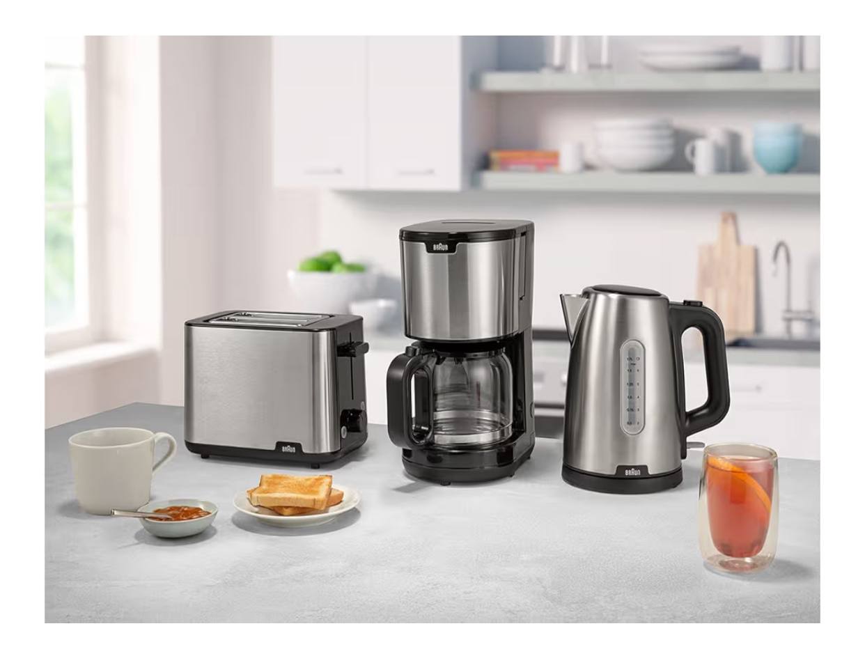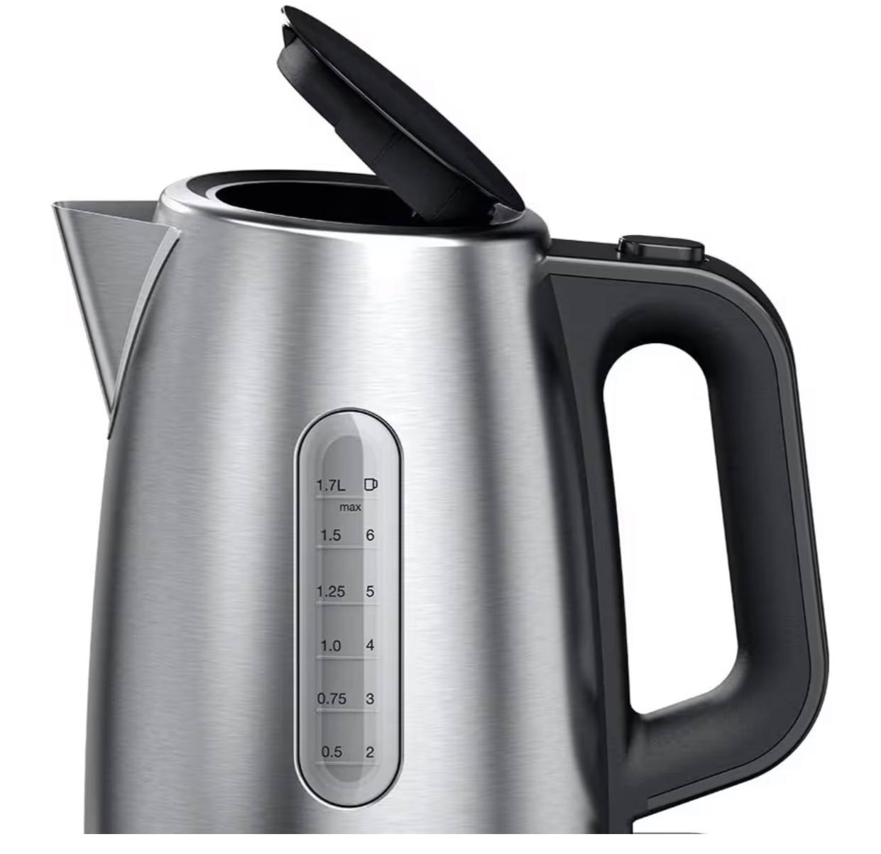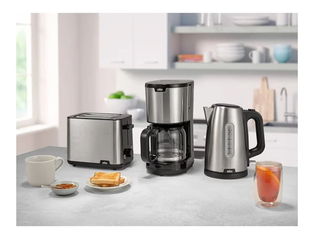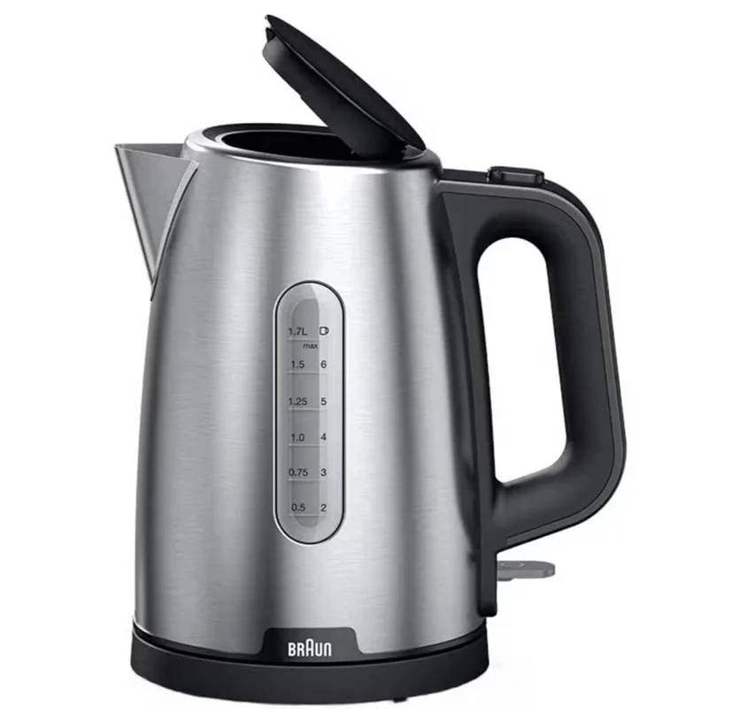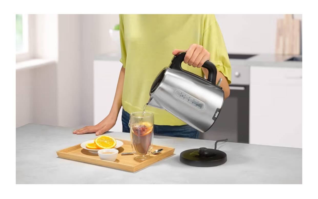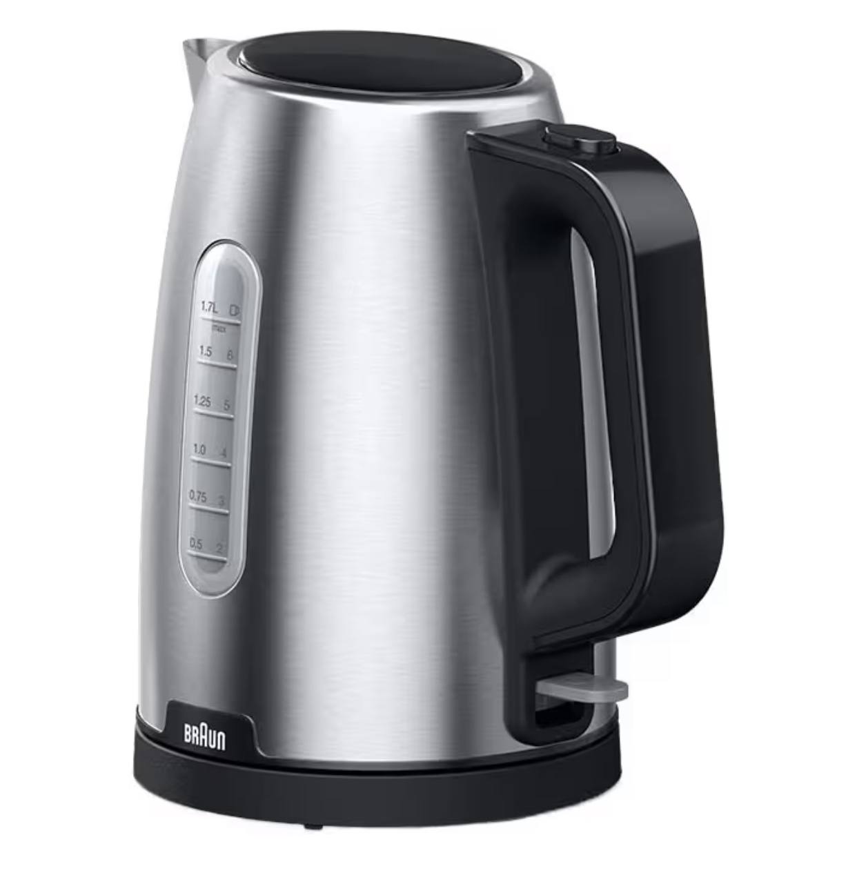 کتری برقی براون مدل WK1500BK با طراحی مدرن و بدنه‌ی استیل ضدزنگ، ترکیبی از زیبایی و کارایی را به آشپزخانه شما می‌آورد. با توان ۲۲۰۰ وات، آب را سریع جوش می‌آورد و ظرفیت ۱.۷ لیتری آن برای استفاده‌ی خانواده مناسب است. فیلتر ضدرسوب، آب سالم و زلال را تضمین می‌کند و سیستم ایمنی هوشمند چندمرحله‌ای خیال شما را از استفاده‌ی ایمن راحت می‌کند. پایه‌ی چرخش ۳۶۰ درجه و دسته‌ی ارگونومیک کار با کتری را آسان می‌کند. این مدل با ترکیب رنگ مشکی و استیل برس‌خورده، جلوه‌ای لوکس به آشپزخانه می‌بخشد.