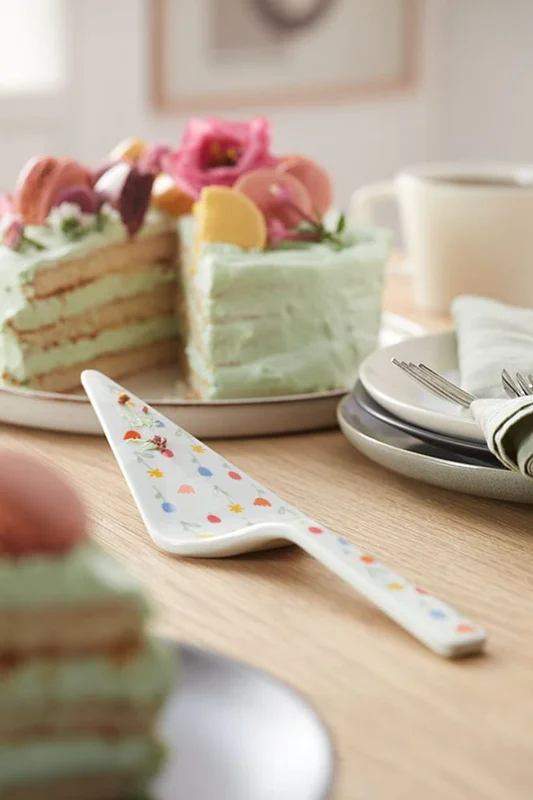 کفگیر کیک چیبو Tchibo کفگیر کیک ابزار ضروری برای هر آشپز و میزبانی است که می خواهد کیک های خود را زیبا و ظریف سرو کند تا از حالت خود خارج نشود. کفگیر سرو کیک چیبو برای انتقال کیک به ظرف مهمان کاربرد داشته و زیبایی میز شما را دوچندان می کند.جنس آن از ملامین بادوام می باشد که به دما حساس بوده و دارای سطح سخت و براق است. شباهت آن به چینی و در نتیجه خواص بهداشتی آن ملامین را برای سرو و میل غذا ایده آل می کند. برای شستشوی محصولات ملامینه می توان از ماشین ظرفشویی استفاده کرد.کف گیر سرو کیک Tchibo به رنگ سفید با طرح گل های آبرنگی که گویی با دست نقاشی شده برای سرو کیک، کلوچه و شیرینی کاربردی می باشد. این محصول فاقد مواد شیمیایی است.