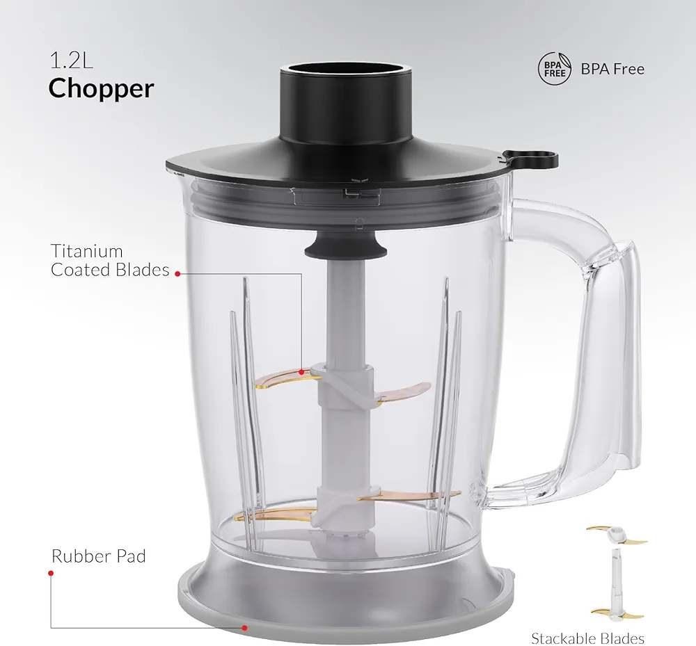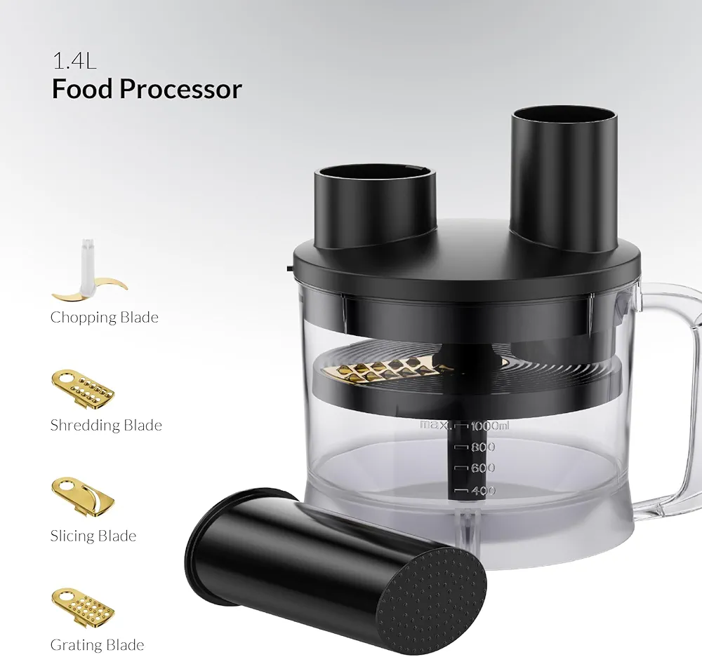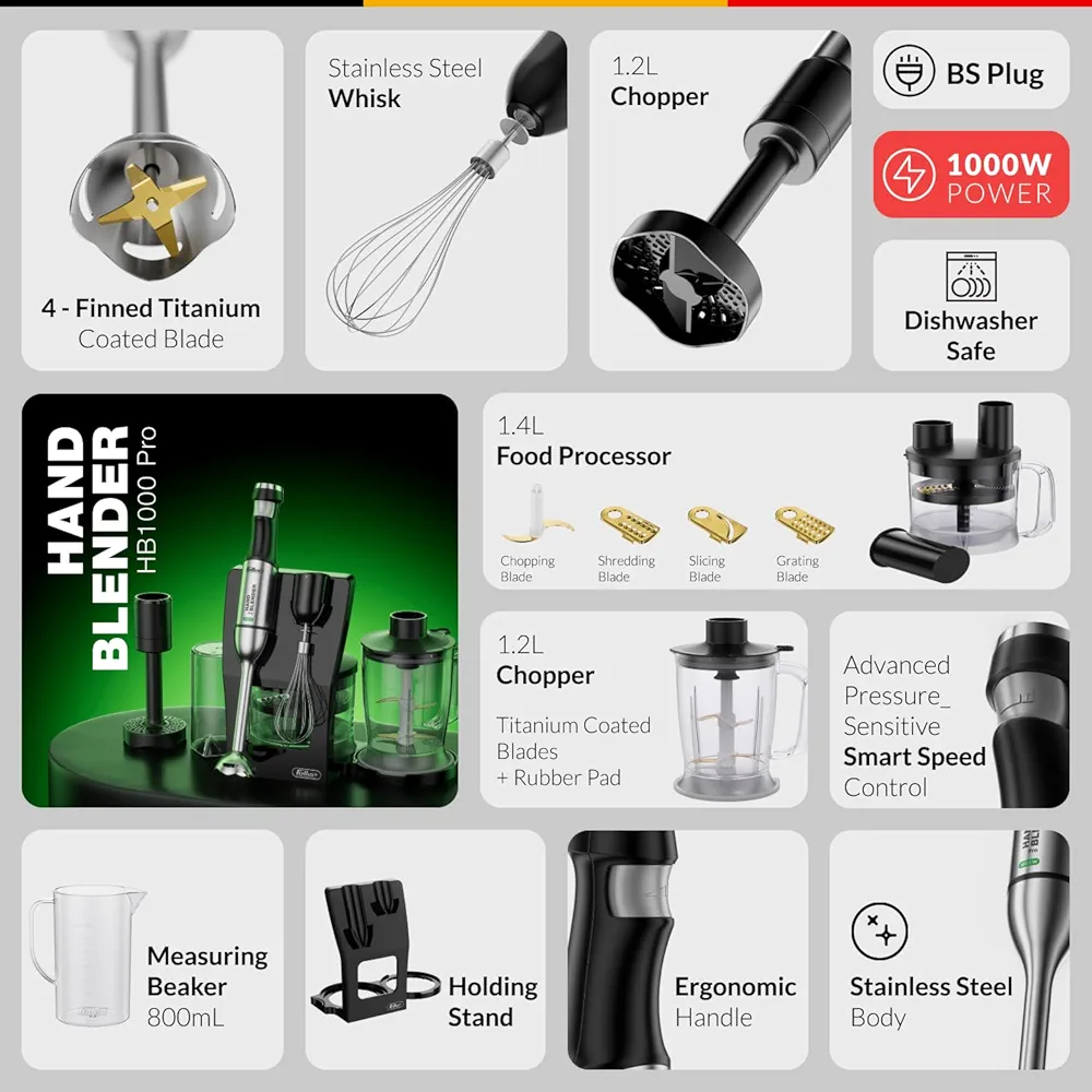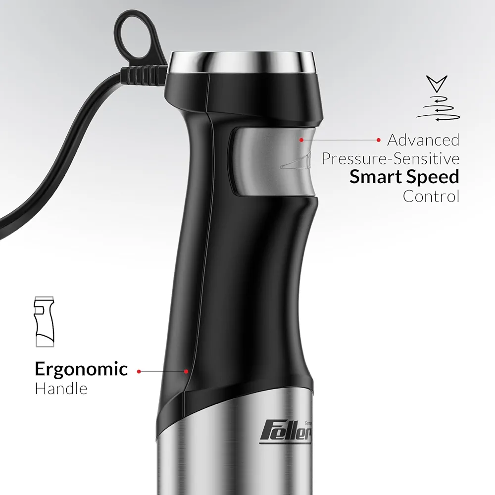 غذاساز چندکاره فلر مدل HB1000 Pro از برند معتبر Feller Germany یک دستگاه حرفهای و قدرتمند برای آمادهسازی سریع انواع مواد غذایی در آشپزخانه است. این محصول با توان 1000 وات و بدنه استیل مقاوم، عملکردی قدرتمند و دوام بالا را تضمین میکند.این مدل به صورت ۵ کاره طراحی شده و همراه با غذاساز 1.8 لیتری، خردکن 1.2 لیتری، همزن و سری پورهساز عرضه میشود تا بتوانید انواع مواد را خرد، مخلوط، هم زده و پوره کنید. تیغه تیتانیومی چهارپره نیز باعث برش یکنواخت و سریع مواد میشود.